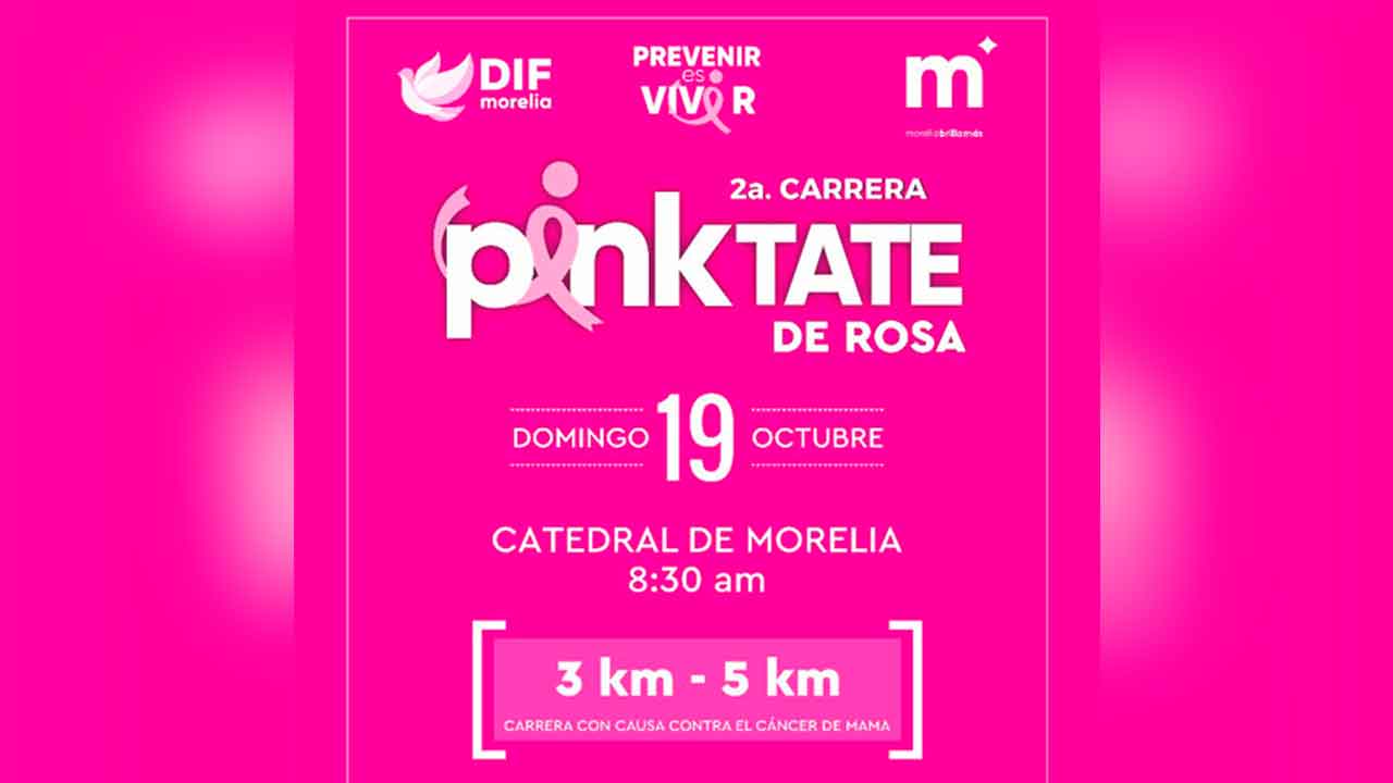 El próximo domingo 19 de octubre de 2025, Morelia será sede de la 2ª Carrera Pinktate de Rosa, un evento deportivo y solidario que busca apoyar a mujeres que enfrentan el cáncer de mama. La salida y meta será en la Catedral de Morelia, con recorridos de 3 y 5 kilómetros, ideales para correr, trotar o caminar en familia.