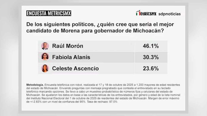 Morelia, Michoacán; a 22 de octubre de 2025.-De acuerdo con la encuesta METRICSMX los mejores evaluados por los ciudadanos para llegar a la gobernatura de Michoacán de cara a las elecciones del 2027 están la diputada Fabiola Alanís y el senador de la república por Michoacán, Raúl Morón Orozco, quienes lideran esta preferencia ciudadana.