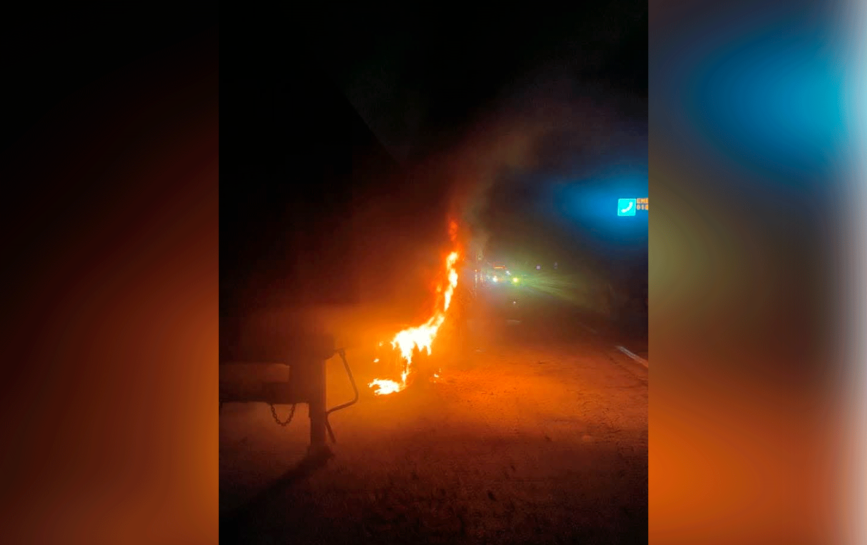 Múgica, Mich.- 22 de octubre de 2025.- La noche de este miércoles, los neumáticos de una góndola que era remolcada por un tractocamión, ardieron en llamas al transitar sobre la autopista Siglo XXI. Oficiales de la Guardia Nacional que pasaban por el sitio combatieron el fuego.