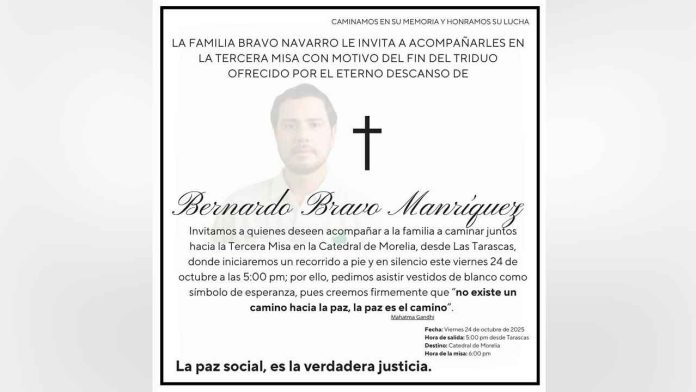“LA FAMILIA BRAVO NAVARRO LE INVITA A ACOMPAÑARLES EN LA TERCERA MISA CON MOTIVO DEL FIN DEL TRIDUO, OFRECIDO POR EL ETERNO DESCANSO DE Bernardo Bravo Manriguez; Invitamos a quienes deseen acompañar a la familia a caminar juntos hacia la Tercera Misa en la Catedral de Morelia, desde Las Tarascas, donde iniciaremos un recorrido a pie y en silencio este viernes 24 de octubre”, se señala.