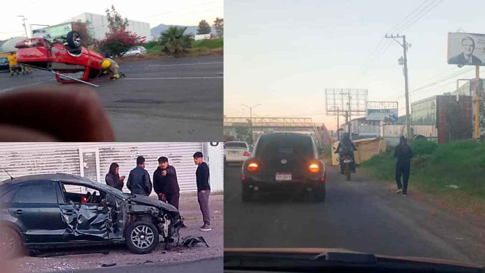 Morelia, Mich.- Miércoles 29 de octubre de 2025.- En distintos hechos, cuatro vehículos se accidentaron y dos de ellos terminaron volcados sobre la avenida Morelos Norte de Morelia, en la salida a Salamanca, informaron fuentes policiales.