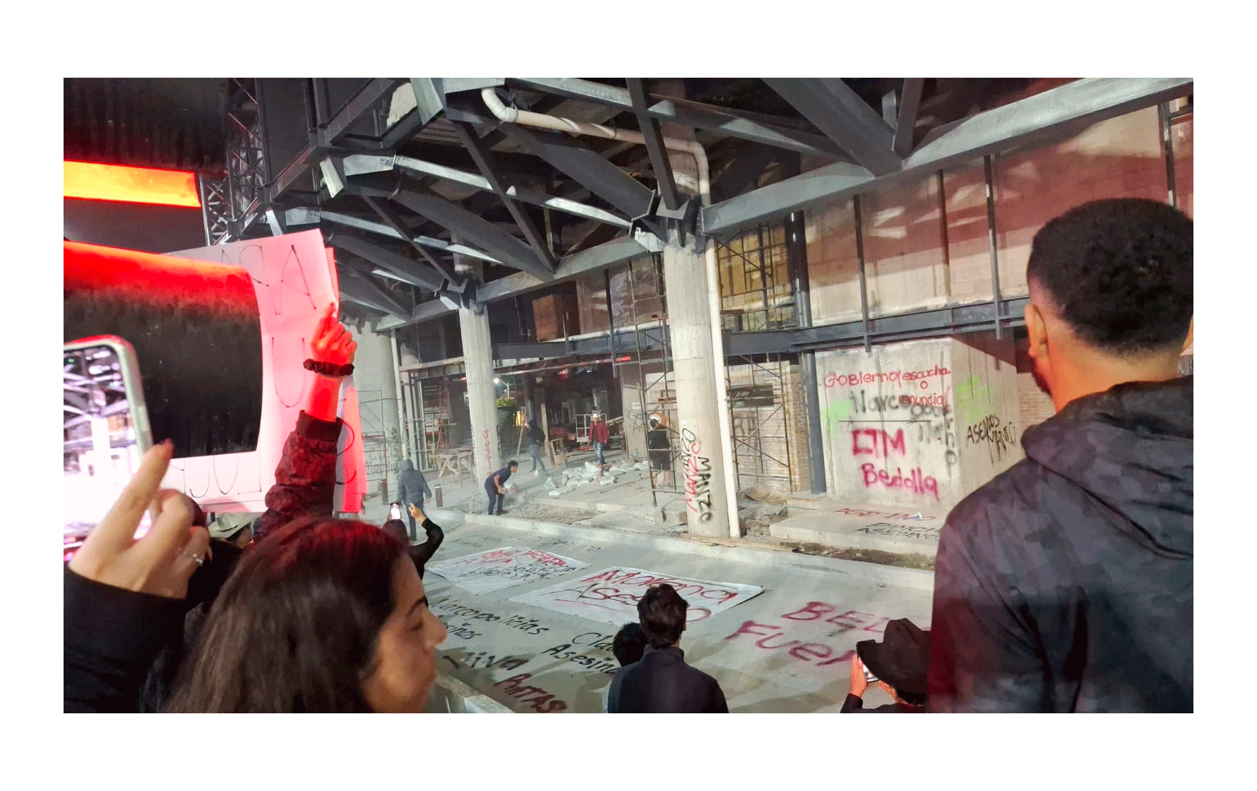 Posteriormente, se realizó una marcha a la estación del Teleférico ubicada sobre el Boulevard Industrial, frente a la plaza Ágora, donde se colocaron cartulinas, pintaron consignas en el edificio y causaron destrozos.