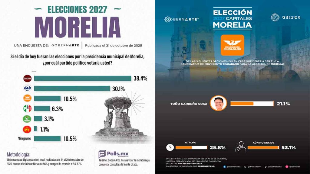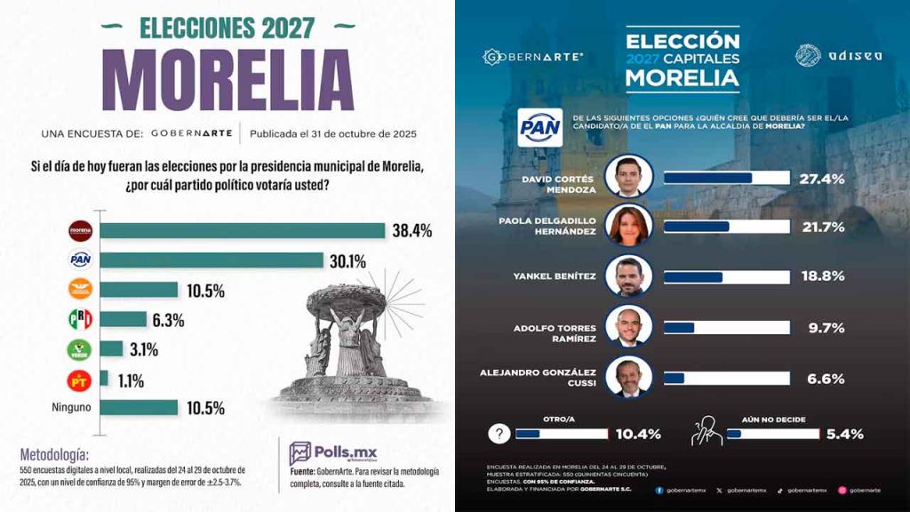 Morelia, Michoacán.– Rumbo a las elecciones municipales de 2027, la capital michoacana se perfila como uno de los escenarios más cerrados del país. De acuerdo con la más reciente medición de la empresa GobernArte, Morena lidera la intención de voto con 38.4 %, mientras que el Partido Acción Nacional (PAN) se coloca en segundo lugar con 30.1 %. La diferencia de apenas 8.3 puntos porcentuales anticipa una contienda sumamente competitiva por la presidencia municipal de Morelia.