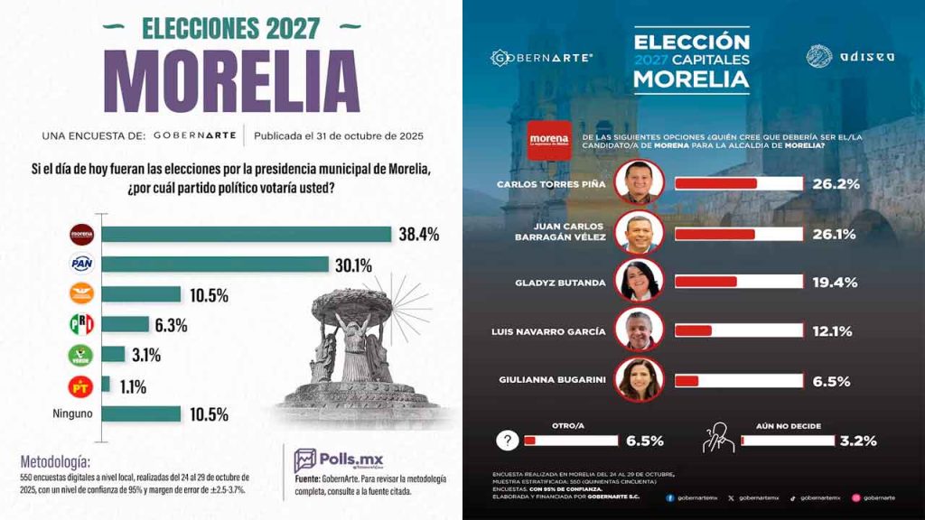 Dentro de Morena, las preferencias se dividen prácticamente en partes iguales entre Carlos Torres Piña, actual fiscal del estado, con 26.2 %, y Juan Carlos Barragán Vélez, diputado local, con 26.1 %. Ambos se perfilan como los principales aspirantes a la candidatura del partido para la alcaldía de Morelia.