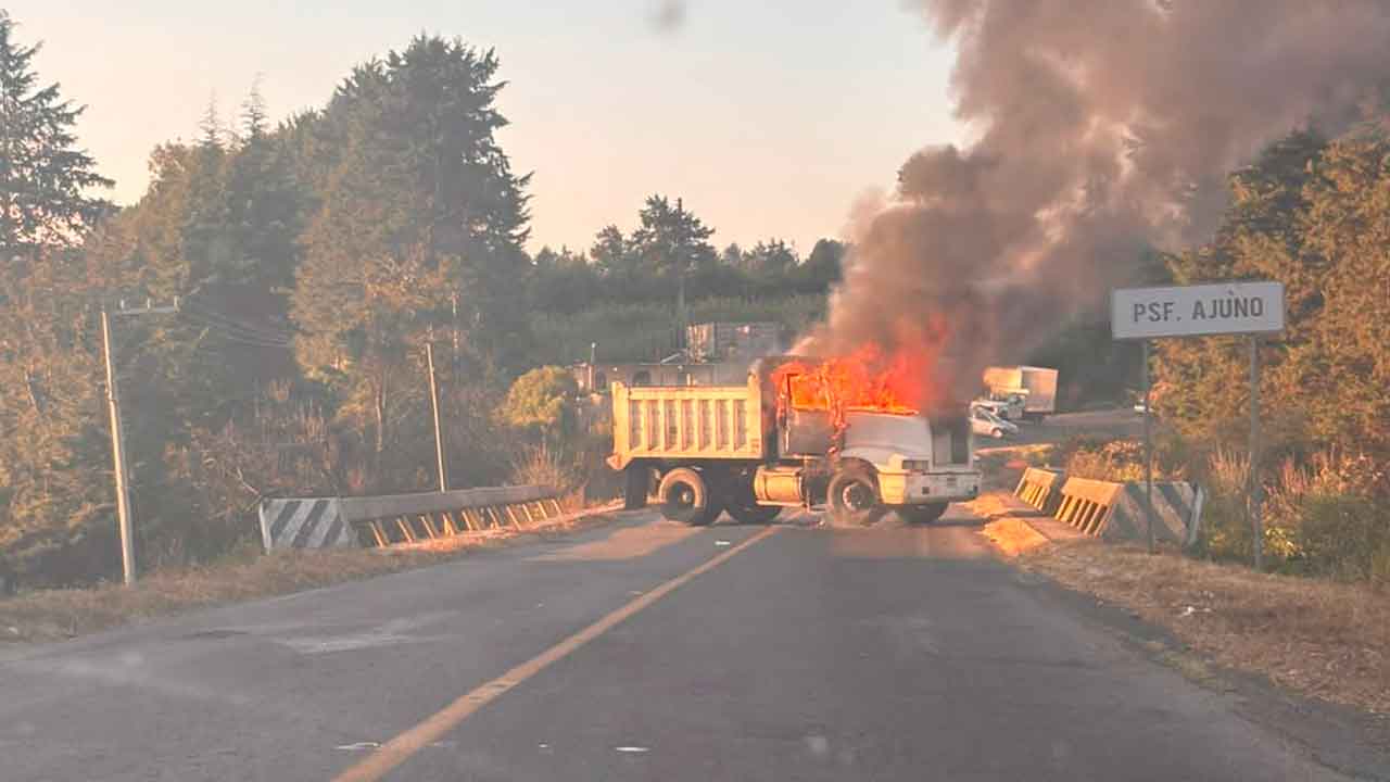 Trascendió que sobre la carretera Pátzcuaro-Uruapan, a la altura de la población de Ajuno, los delincuentes atravesaron un camión tipo volteo y lo quemaron.