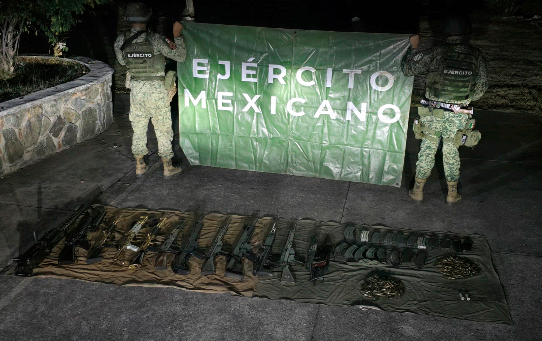 Los castrenses incautaron 2 ametralladoras Browning calibre .50”, 1 ametralladora RPD calibre 7.62 x 39 mm, 11 armas largas de diferentes tipos y calibres, 1 aditamento laza granadas calibre 40 mm, 3 granadas calibre 40 mm, 91 cargadores para diferentes tipos de armas, 2,878 cartuchos.