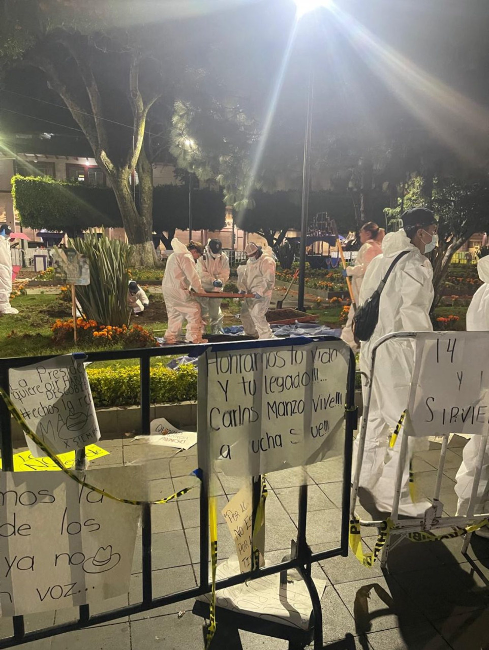 Uruapan, Mich.- Noviembre de 2025.- La noche de este lunes, personal de la Fiscalía General del Estado (FGE) realizó nuevas diligencias en el lugar donde fue asesinado a balazos el alcalde Carlos Manzo Rodríguez, el pasado sábado primero de noviembre.