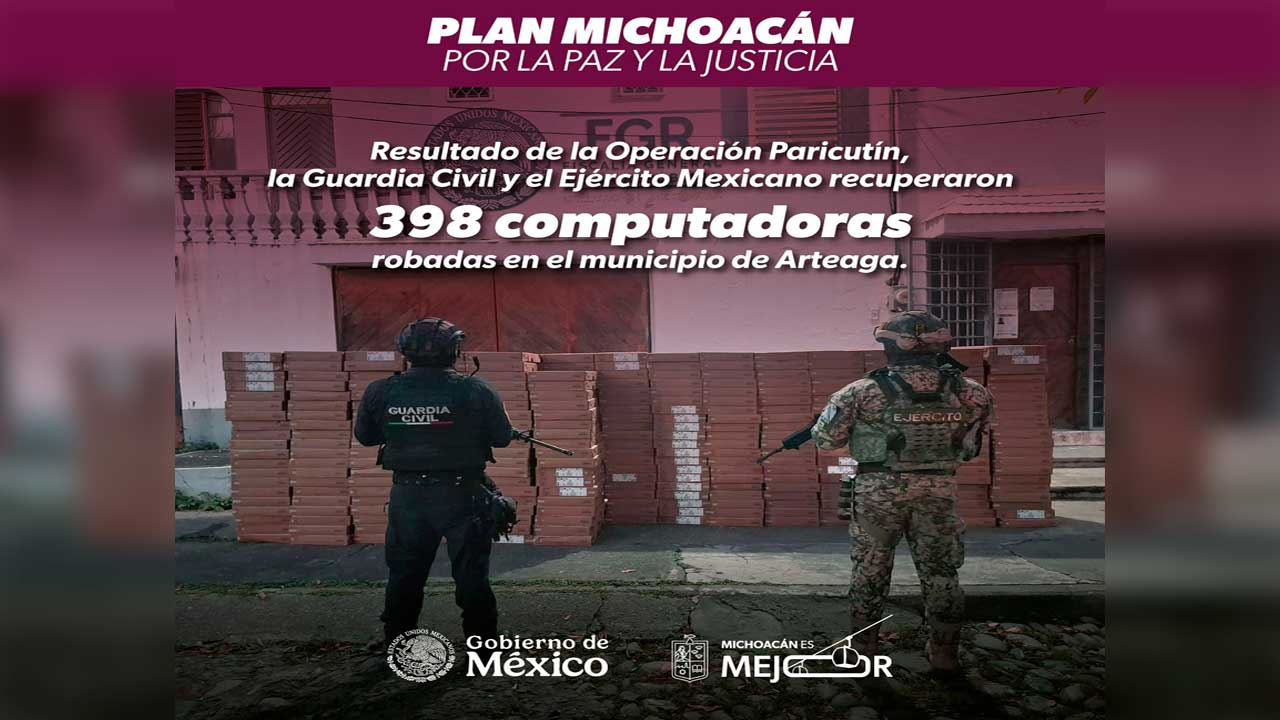 Arteaga, Michoacán, 12 de noviembre de 2025.- La Operación Paricutín permitió efectuar una labor interinstitucional coordinada entre las secretarías de Seguridad Pública (SSP) y de la Defensa Nacional (Defensa), en la cual se recuperaron 398 computadoras nuevas que habían sido robadas en el municipio de Arteaga.