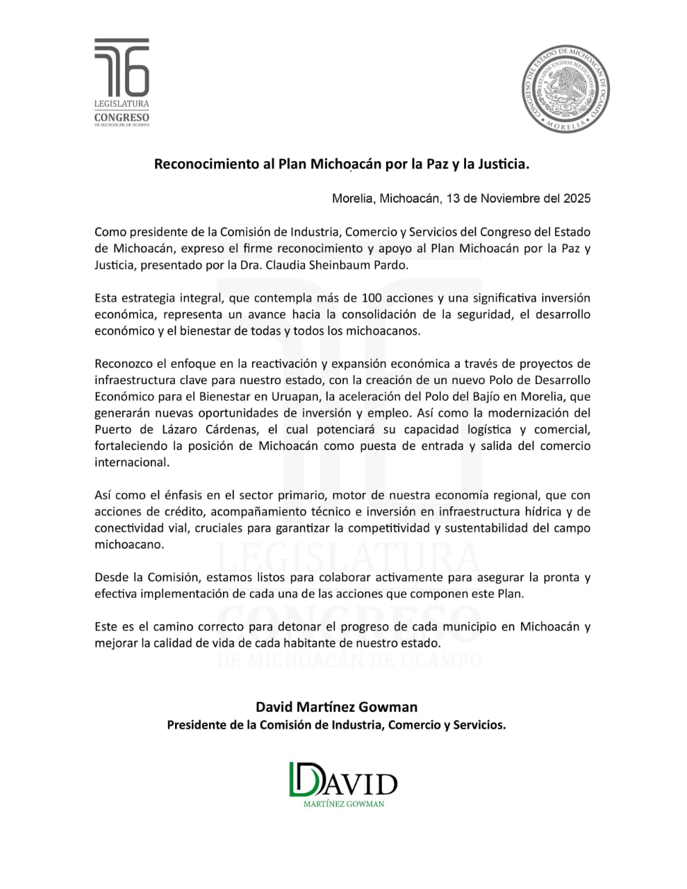 El diputado David Martínez Gowman, presidente de la Comisión de Industria, Comercio y Servicios del Congreso del Estado de Michoacán, emitió un comunicado expresando su firme reconocimiento y apoyo al Plan Michoacán por la Paz y Justicia, presentado por la Dra. Claudia Sheinbaum Pardo.
