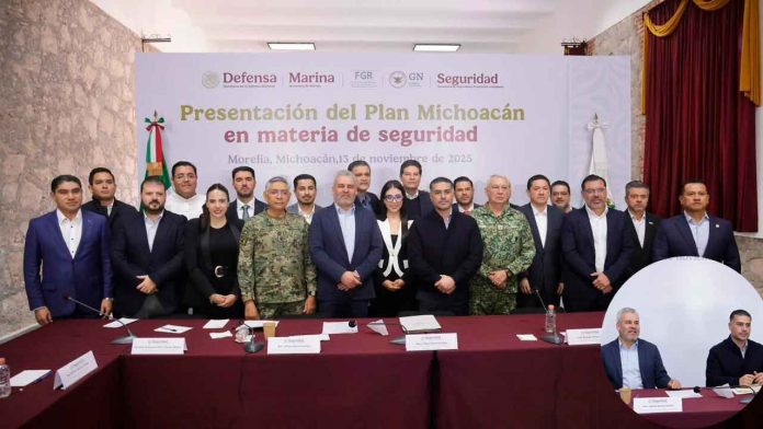 Morelia, Michoacán, 13 de noviembre de 2025.- En reunión sostenida en el cuartel de la 21 Zona Militar, el gobernador Alfredo Ramírez Bedolla; el secretario de Seguridad y Protección Ciudadana, Omar García Harfuch; el titular de la Secretaría de la Defensa Nacional, Ricardo Trevilla Trejo, y la Secretaría de Marina, revisaron la estrategia de seguridad y prevención al delito para reforzar las acciones del Plan Michoacán por la Paz y la Justicia.