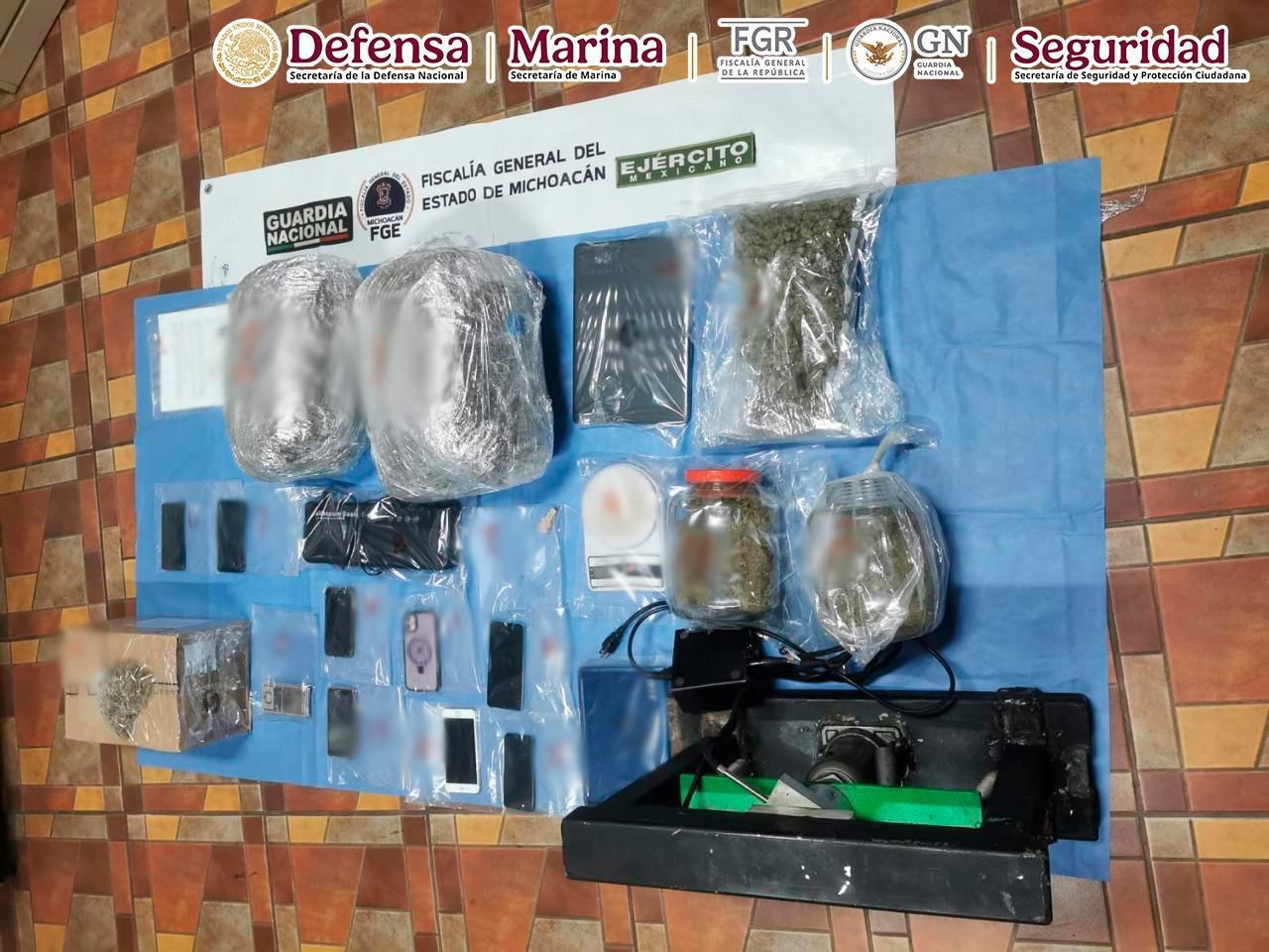 Asimismo, al realizar acciones de seguridad y vigilancia en el municipio de Morelia, aseguraron cinco kilos de marihuana, dos equipos de cómputo, nueve teléfonos celulares, una prensa hidráulica, una báscula gramera y una máquina selladora.