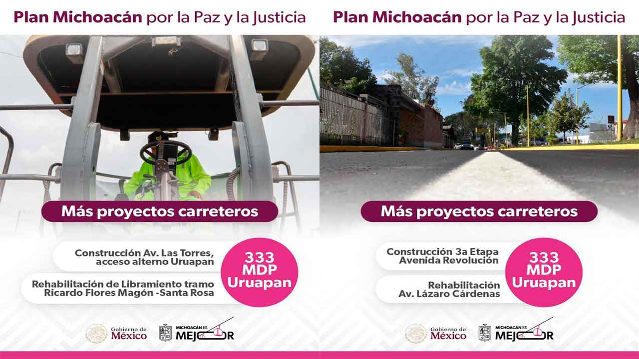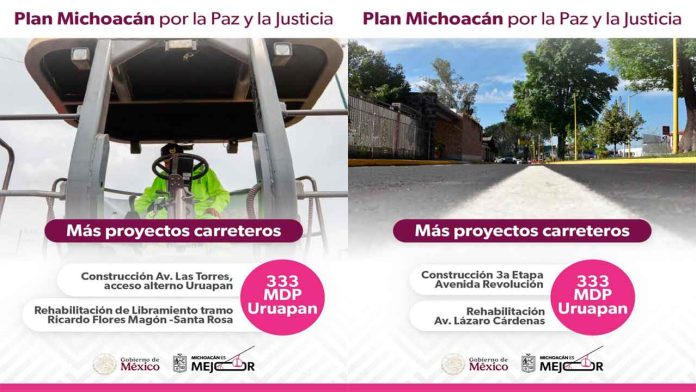 Uruapan, Michoacán, 15 de noviembre de 2025.- Dentro del Plan Michoacán por la Paz y la Justicia, que impulsa la presidenta Claudia Sheinbaum Pardo en conjunto con el Gobierno estatal, se tienen contempladas obras de infraestructura para la región Uruapan con una inversión de 333 millones de pesos.