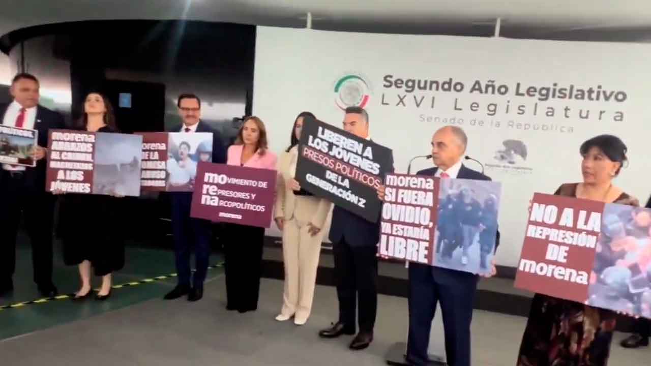 En el evento, los diputados y senadores mostraron mantas con mensajes como “No más represión”, “No a la violencia del Estado” y “Liberen a los jóvenes”, con lo que manifestaron su rechazo a lo que califican como intimidación política. Además, desde su tribuna describieron al oficialismo como “narcopolítico”, acusando que su estrategia prioriza reprimir a quienes protestan en lugar de atender la crisis de seguridad.