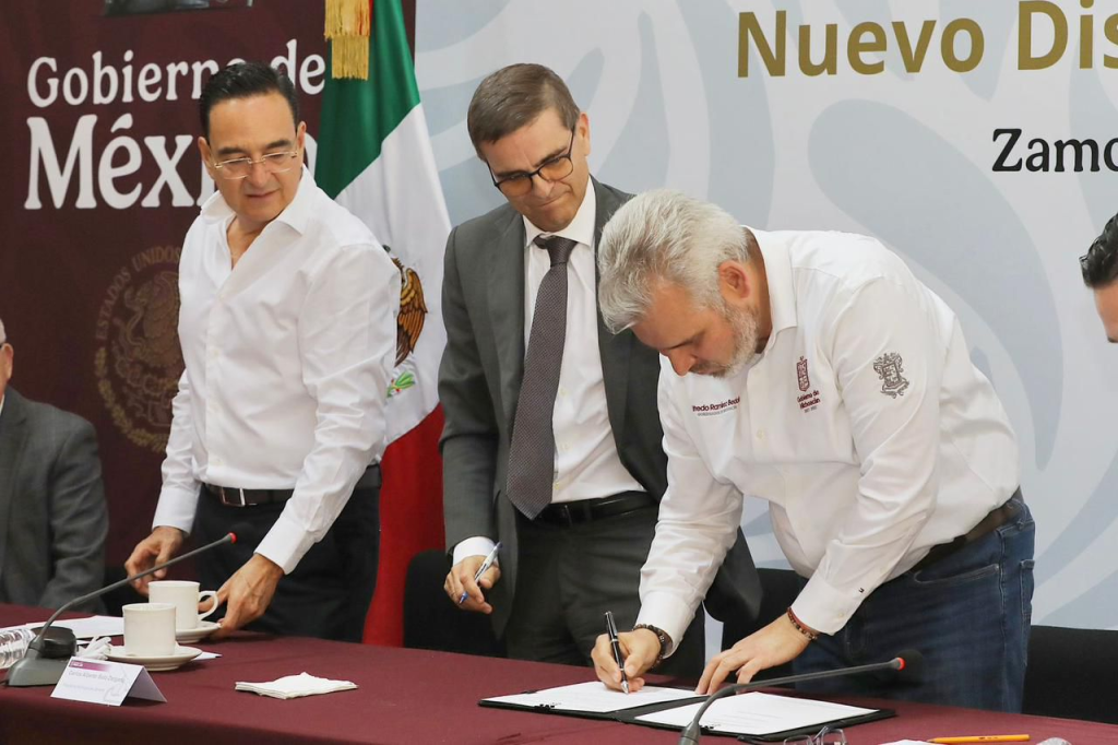 El mandatario firmó un nuevo título de concesión con el director de la empresa Red Carreteras de Occidente (RCO), Gonzalo Alcalde Rodríguez, para la renovación de 3.6 kilómetros de la carretera El Sauz-La Rinconada y la construcción de un distribuidor vial, obras que beneficiarán a los habitantes de Zamora, Ecuandureo, Jacona e Ixtlán.