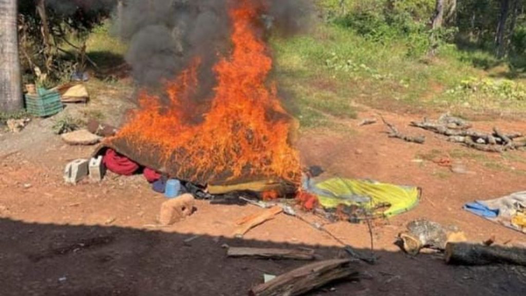 Uruapan, Michoacán, 22 de noviembre del 2025.- Dentro del Plan Paricutín dentro del Plan Michoacán por la Paz y la Justicia, elementos de las secretarías de Seguridad Pública (SSP) y Defensa Nacional (Defensa) localizaron e destruyeron dos campamentos clandestinos; además fueron asegurados un vehículo con reporte de robo y cinco kilogramos de sustancia granulada con las características propias de la metanfetamina, así como un vehículo con reporte de robo vigente.
