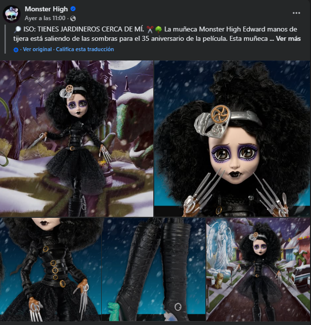 Monster High presentó una muñeca de colección inspirada en Edward Scissorhands para conmemorar el 35 aniversario de la película de Tim Burton. La edición especial forma parte de la línea Skullector y fusiona el estilo gótico del clásico cinematográfico con la estética característica de la marca.