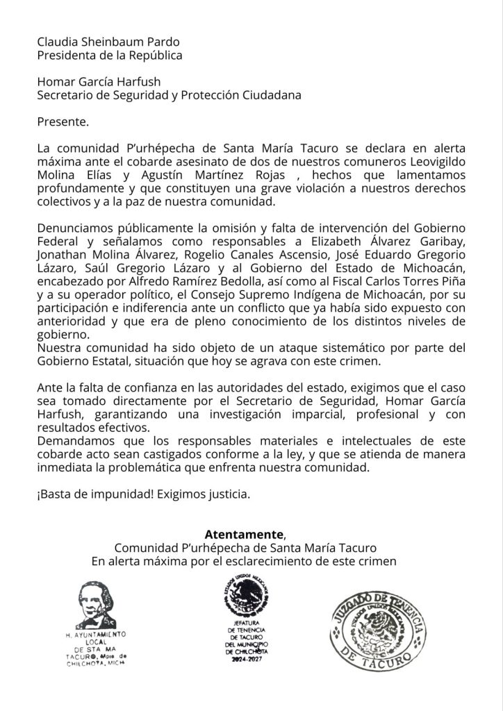 La comunidad purépecha de Santa María Tacuro, en el municipio de Chilchota, Michoacán, se declaró en alerta máxima tras el asesinato de dos de sus comuneros: Leovigildo Molina Elías y Agustín Martínez Rojas. En un pronunciamiento dirigido a la presidenta Claudia Sheinbaum y al titular de Seguridad federal, Homar García Harfush, la comunidad calificó el hecho como un “cobarde ataque” y una “grave violación a sus derechos colectivos y a la paz” de la zona.