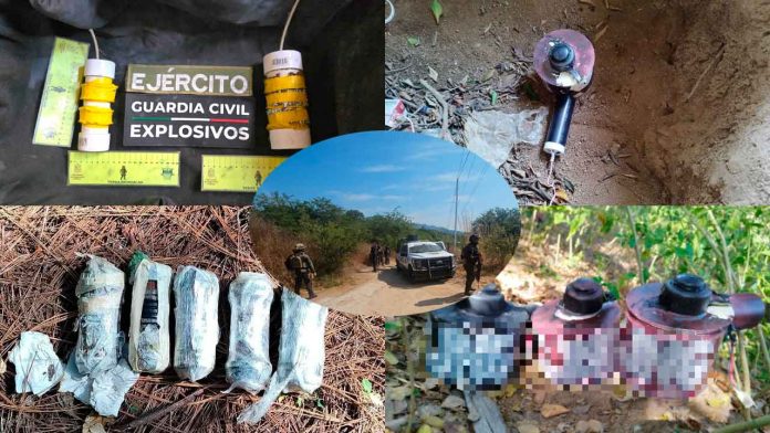 También durante tareas interinstitucionales coordinadas en el poblado de Pedernales, municipio de Tacámbaro, se aseguraron dos granadas de mano hechizas, elaboradas con tubos de PVC y pólvora aluminizada en su carga explosiva, con mecha y metralla con clavos de acero para concreto adheridos a los artefactos.