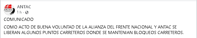 En un comunicado difundido en Facebook, los integrantes del Frente Nacional y la Asociación Nacional de Transportistas (ANTAC) informaron que la liberación parcial de carreteras fue un “acto de buena voluntad” para avanzar en el diálogo con el gobierno federal.