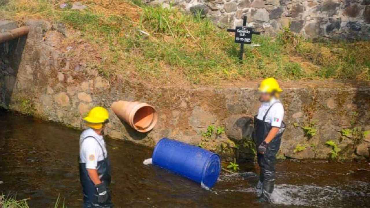 Uruapan, Mich.- 29 de noviembre de 2025.- El cadáver de una mujer joven que estaba en el interior de un tambo de plástico, fue localizado en un río que atraviesa la colonia 18 de Marzo, al oriente de la ciudad de Uruapan.