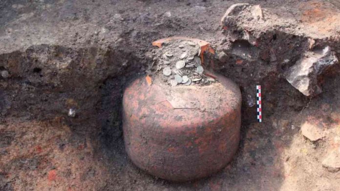 El tesoro apareció dentro de grandes vasijas de cerámica —ánforas— cuidadosamente enterradas en fosas preparadas, bien niveladas y verticales. Los restos de varias viviendas y la estructura urbana recuperada sugieren que se trata de una comunidad habitada por personas de cierto nivel, posiblemente artesanos o comerciantes.