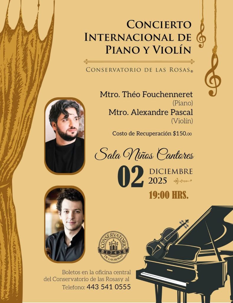 El Conservatorio de las Rosas anunció un recital especial de piano y violín que se llevará a cabo el 2 de diciembre de 2025, a las 19:00 horas, en la Sala Niños Cantores. El programa estará a cargo del pianista francés Théo Fouchenneret y del violinista Alexandre Pascal, ambos reconocidos por su trayectoria en la música de cámara europea.