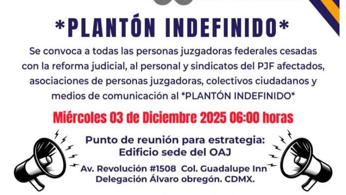 Un grupo de personas juzgadoras federales cesadas anunció la realización de un plantón indefinido este miércoles 3 de diciembre de 2025 frente al edificio sede del Órgano de Administración Judicial (OAJ) en la Ciudad de México, como parte de sus acciones de protesta por lo que consideran incumplimientos derivados de la Reforma Judicial.