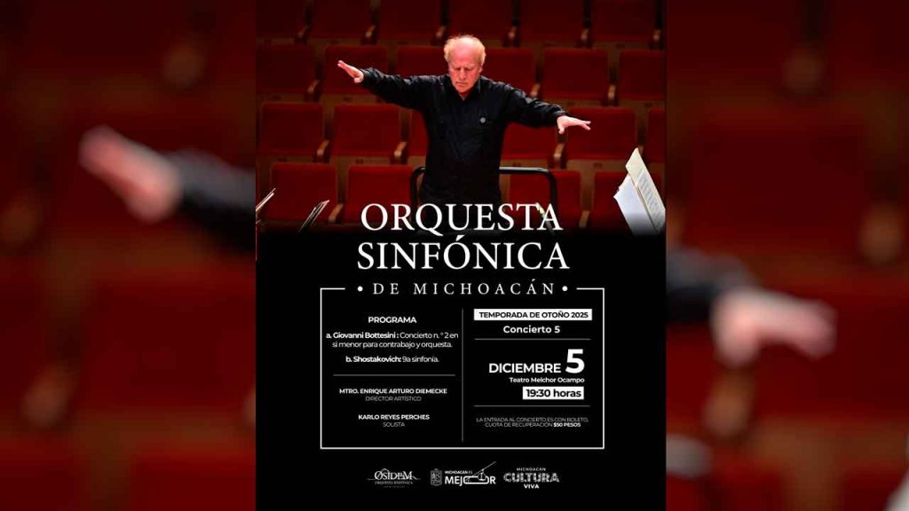 Morelia, Michoacán, 1 de diciembre de 2025.- La Secretaría de Cultura de Michoacán (Secum) y la Orquesta Sinfónica de Michoacán (Osidem) invitan al público a su quinto concierto de la Temporada de Otoño 2025, bajo la dirección del maestro Enrique Arturo Diemecke y con la participación del destacado contrabajista michoacano Karlo Reyes Perches como solista invitado.