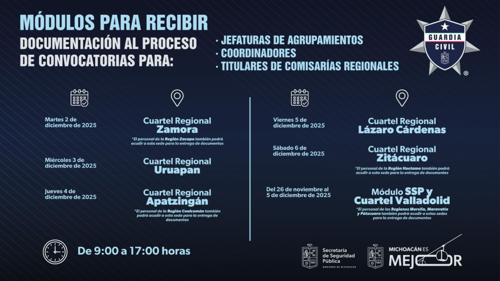 Morelia, Michoacán, 1 de diciembre de 2025.- La Secretaría de Seguridad Pública (SSP), encabezada por José Antonio Cruz Medina, habilitó módulos de registro en siete municipios del estado para que el personal operativo participe en las convocatorias de mandos de la Guardia Civil, correspondientes a jefaturas de agrupamientos, coordinaciones y comisarías regionales.
