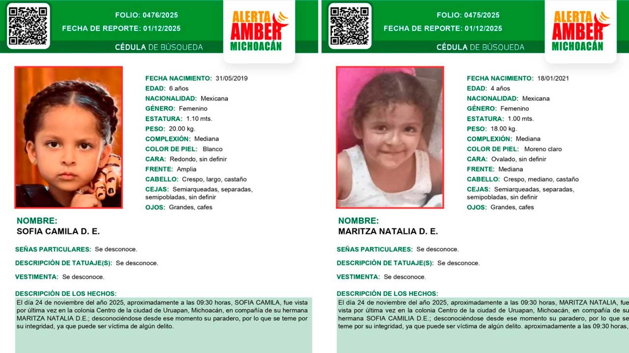 Dos niñas, Maritza Natalia (4 años) y Sofía Camila (6 años)— permanecen desaparecidas tras la aparición sin vida de su madre en Uruapan, Michoacán. Su madre, Maritza Espino Ponce, de 28 años, había sido reportada como desaparecida desde el 24 de noviembre de 2025, fecha en la que fue vista por última vez con sus hijas.
