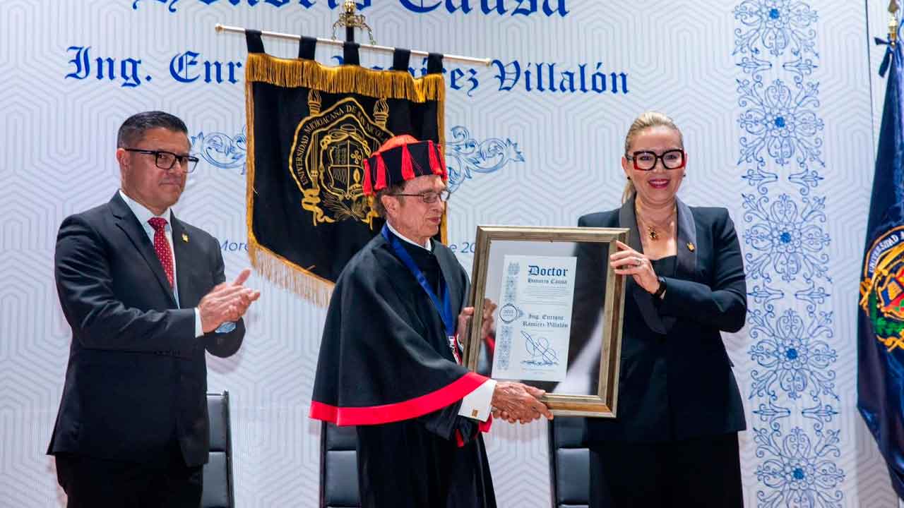Morelia, Michoacán, a 05 de diciembre de 2025.- El ingeniero Enrique Ramírez Villalón fue condecorado con el Grado de Doctor Honoris Causa que otorga la Universidad Michoacana de San Nicolás de Hidalgo (UMSNH), en este marco, la rectora Yarabí Ávila González, señaló que el galardonado es un michoacano ejemplar, cuya visión empresarial ha trascendido fronteras y cuyo impacto social es reconocido en México y en el mundo.