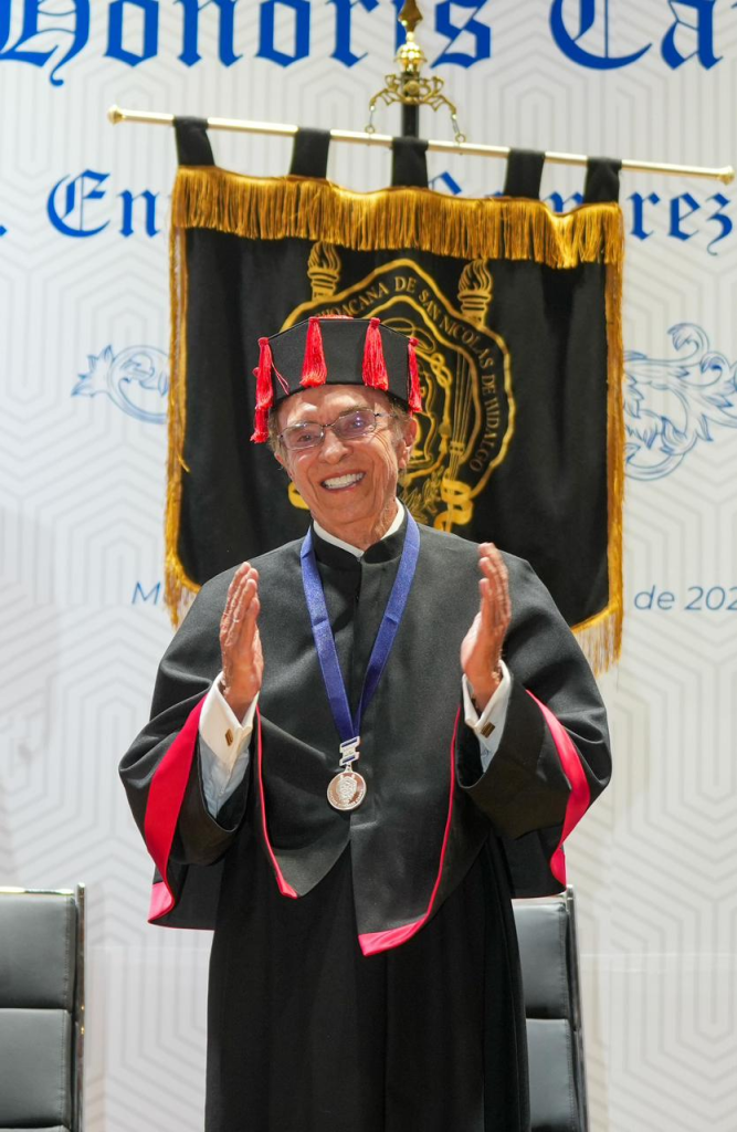 De igual forma manifestó su agradecimiento a su esposa, hijos, hermanos, nietas y nietos, y a toda su familia, “no puedo estar más feliz, rodeado de tanto cariño, siento que hoy completo un ciclo importante en mi vida, recibir este Doctorado Honoris Causa en Morelia, donde nací y donde todo arrancó”.