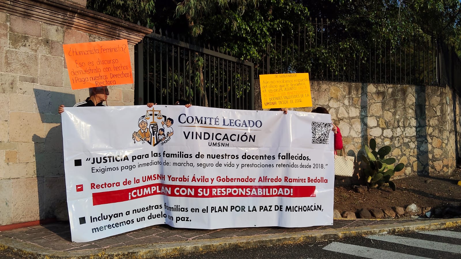 Con una serie de pancartas y lonas exigen atención de las autoridades, ya que acusan que Yarabí Ávila González, rectora de la UMSNH, solo se toma fotos y dice discursos que discrepan con lo que viven los deudos.