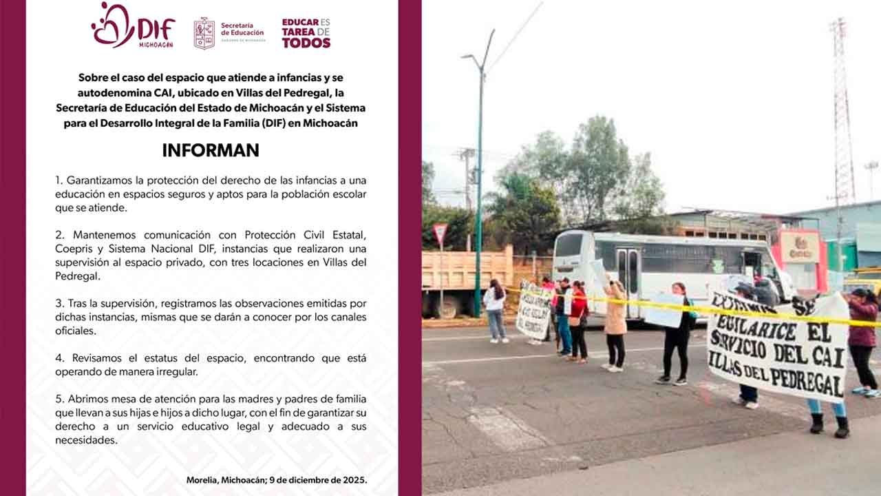 Morelia, Michoacán; 9 de diciembre de 2025: La Secretaría de Educación del Estado de Michoacán y el Sistema para el Desarrollo Integral de la Familia (DIF) en Michoacán informaron que el espacio que atiende a infancias y se autodenomina CAI, ubicado en Villas del Pedregal, está operando de manera irregular.