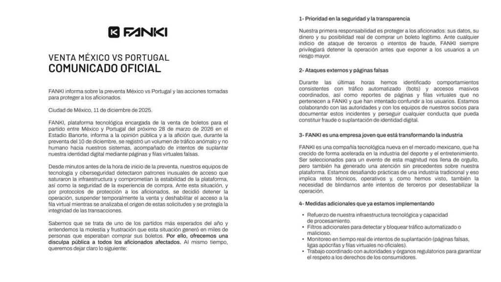11 de diciembre de 2025.- La empresa FANKI, responsable de la preventa de boletos para el partido México vs Portugal programado para el 28 de marzo de 2026 en el Estadio Banorte, informó que la interrupción del proceso de compra del 10 de diciembre se debió a un volumen inusual de tráfico automatizado, intentos de fraude digital y presencia de páginas falsas que intentaron suplantar a la plataforma oficial.