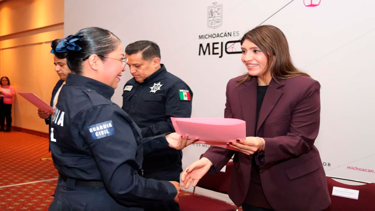 Morelia, Michoacán, 16 de diciembre de 2025.— La secretaria de Igualdad Sustantiva y Desarrollo de las Mujeres Michoacanas, Alejandra Anguiano González, en coordinación con el secretario de Seguridad Pública, José Antonio Cruz Medina y la Policía Auxiliar, realizó la clausura del Curso Especializado en Materia de Primer Respondiente con Perspectiva de Género, en donde participaron 2 mil 134 personas servidoras públicas.