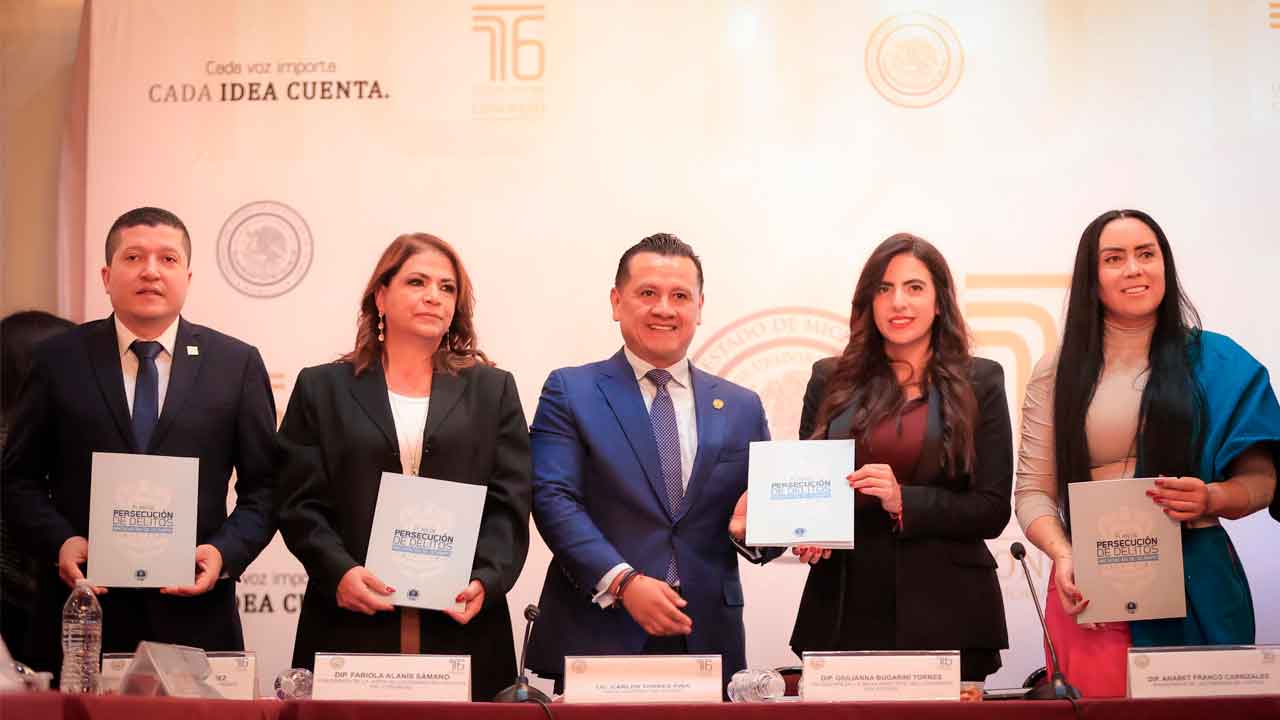 Morelia, Michoacán, a 16 de diciembre de 205.- El Congreso del Estado de Michoacán recibió el Plan de Persecución Penal 2025–2034, presentado por el Fiscal General del Estado, Carlos Torres Piña, en un acto encabezado por la diputada Giulianna Bugarini Torres, presidenta de la Mesa Directiva de la 76 Legislatura, quien destacó que se trata de un paso clave para fortalecer la procuración de justicia en la entidad.