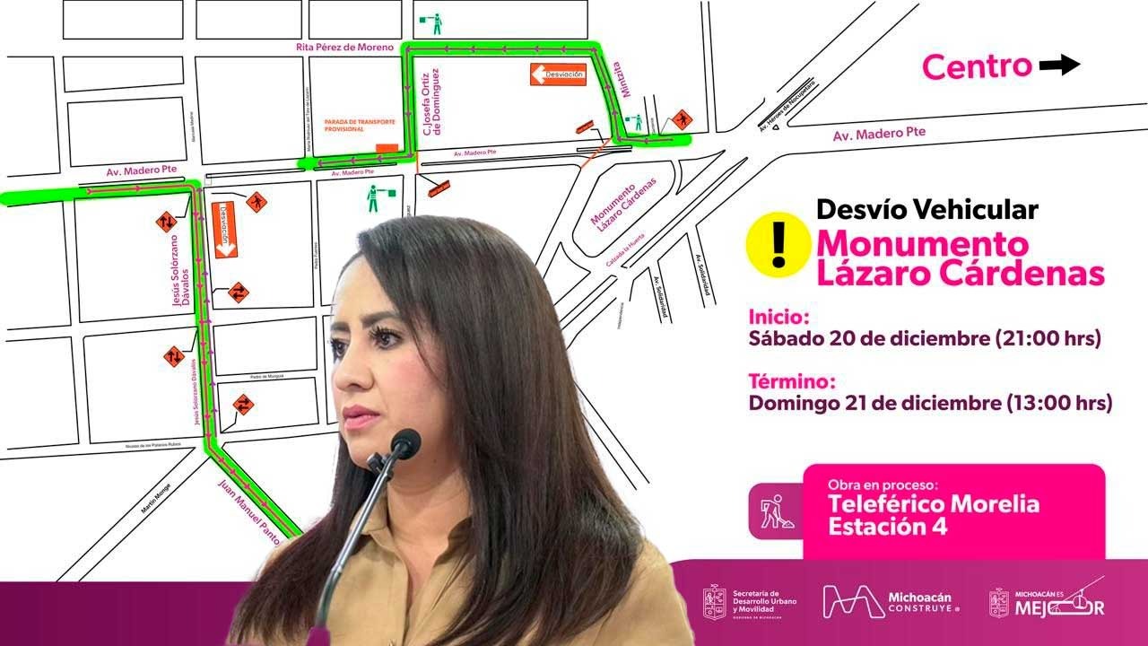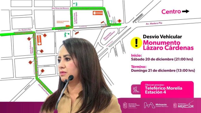 Morelia, Michoacán, 19 de diciembre de 2025.- La secretaria de Desarrollo Urbano y Movilidad, Gladyz Butanda Macías, informó que, por obras del teleférico de Morelia, la circulación vehicular en el monumento a Lázaro Cárdenas se ajustará este sábado 20 de diciembre a partir de las 21:00 horas y será normalizada el domingo 21 de diciembre a las 13:00 horas.