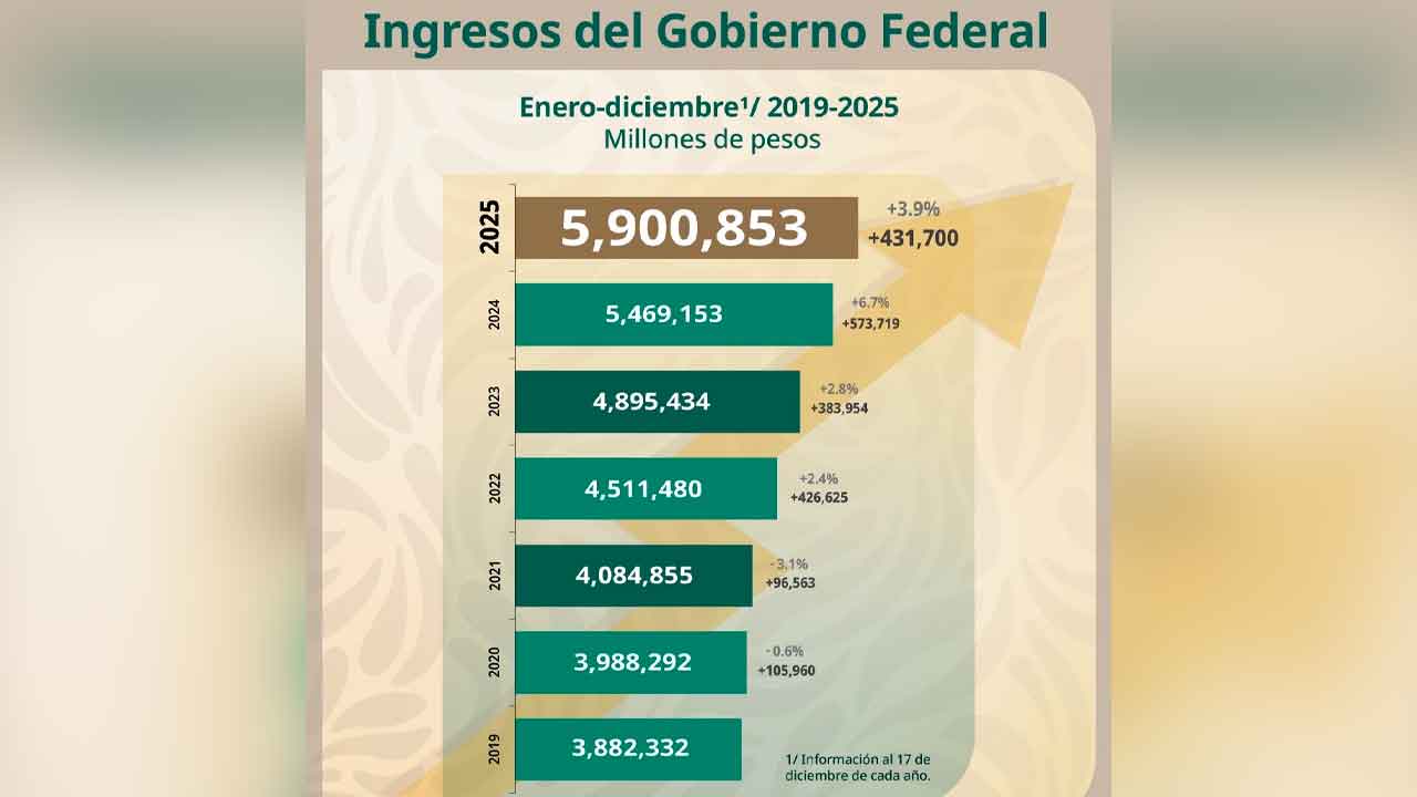 El reporte del SAT y la Secretaría de Hacienda muestra la evolución de los ingresos del Gobierno Federal entre 2019 y 2025, destacando un aumento constante: de 3.88 billones en 2019 a 5.9 billones de pesos en 2025, reflejando un crecimiento sostenido de la recaudación fiscal en el país.