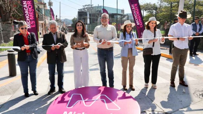 Uruapan, Michoacán, 19 de diciembre de 2025.- El Plan Michoacán por la Paz y la Justicia se está haciendo efectivo y como prueba de ello la secretaría de Desarrollo Urbano y Movilidad, Gladyz Butanda Macías, rehabilitó tres calles y una unidad deportiva en la colonia Antorchistas de Uruapan, obras complementarias al teleférico.