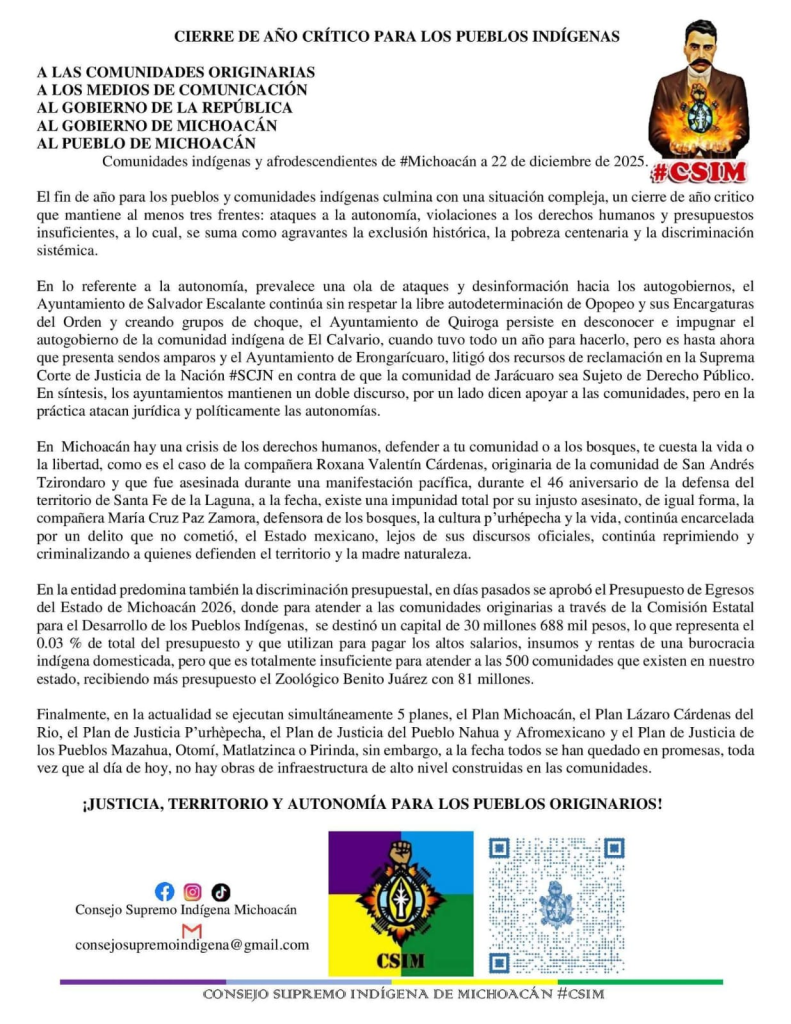 “En la entidad predomina también la discriminación presupuestal, en días pasados se aprobó el Presupuesto de Egresos del Estado de Michoacán 2026, donde para atender a las comunidades originarias a través de la Comisión Estatal para el Desarrollo de los Pueblos Indígenas, se destinó un capital de 30 millones 688 mil pesos, lo que representa el 0.03 % de total del presupuesto y que utilizan para pagar los altos salarios, insumos y rentas de una burocracia indígena domesticada”, se lee en documento.
