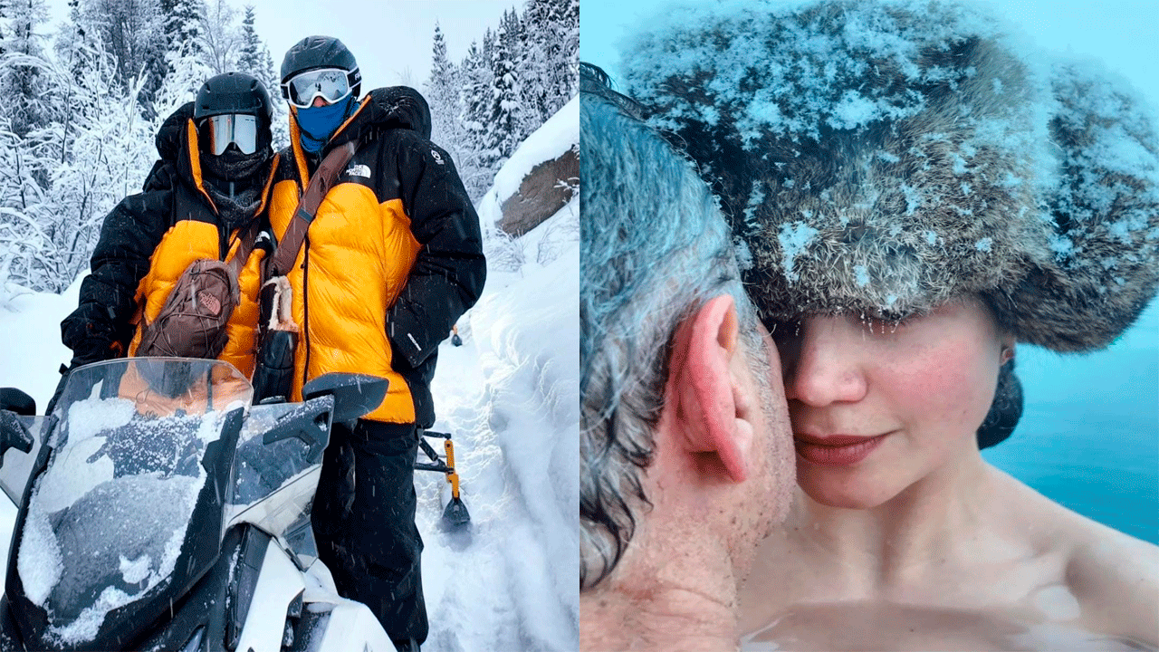 La pareja compartió en redes sociales imágenes y videos del viaje, donde se les ve disfrutando de actividades típicas del invierno extremo. Uno de los momentos que más llamó la atención fue su visita a las aguas termales al aire libre de Chena Hot Springs, famosas por su agua mineral natural y el contraste con el clima helado. Allí, el vapor y el frío crearon un escenario único que ambos documentaron con entusiasmo.