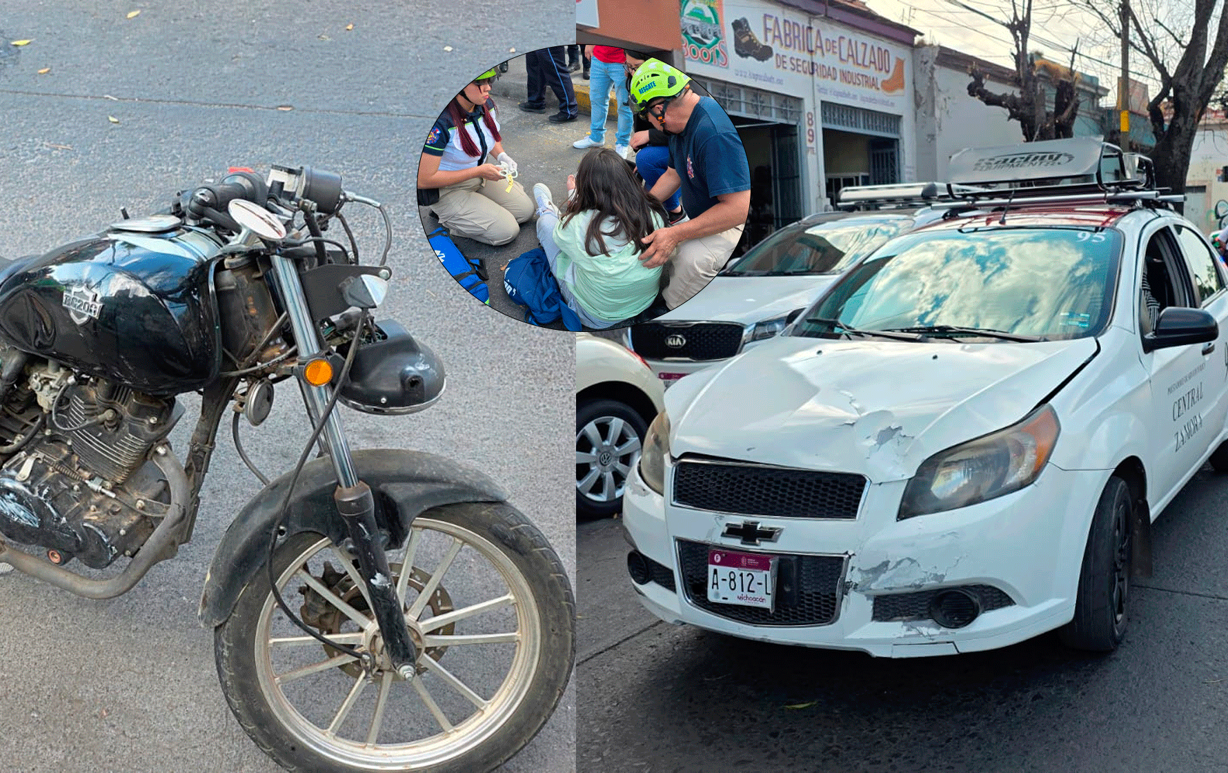 Zamora, Mich.- 29 de diciembre de 2025.- El choque entre una motocicleta y una unidad de alquiler dejó como saldo una mujer lesionada y algunos daños materiales.