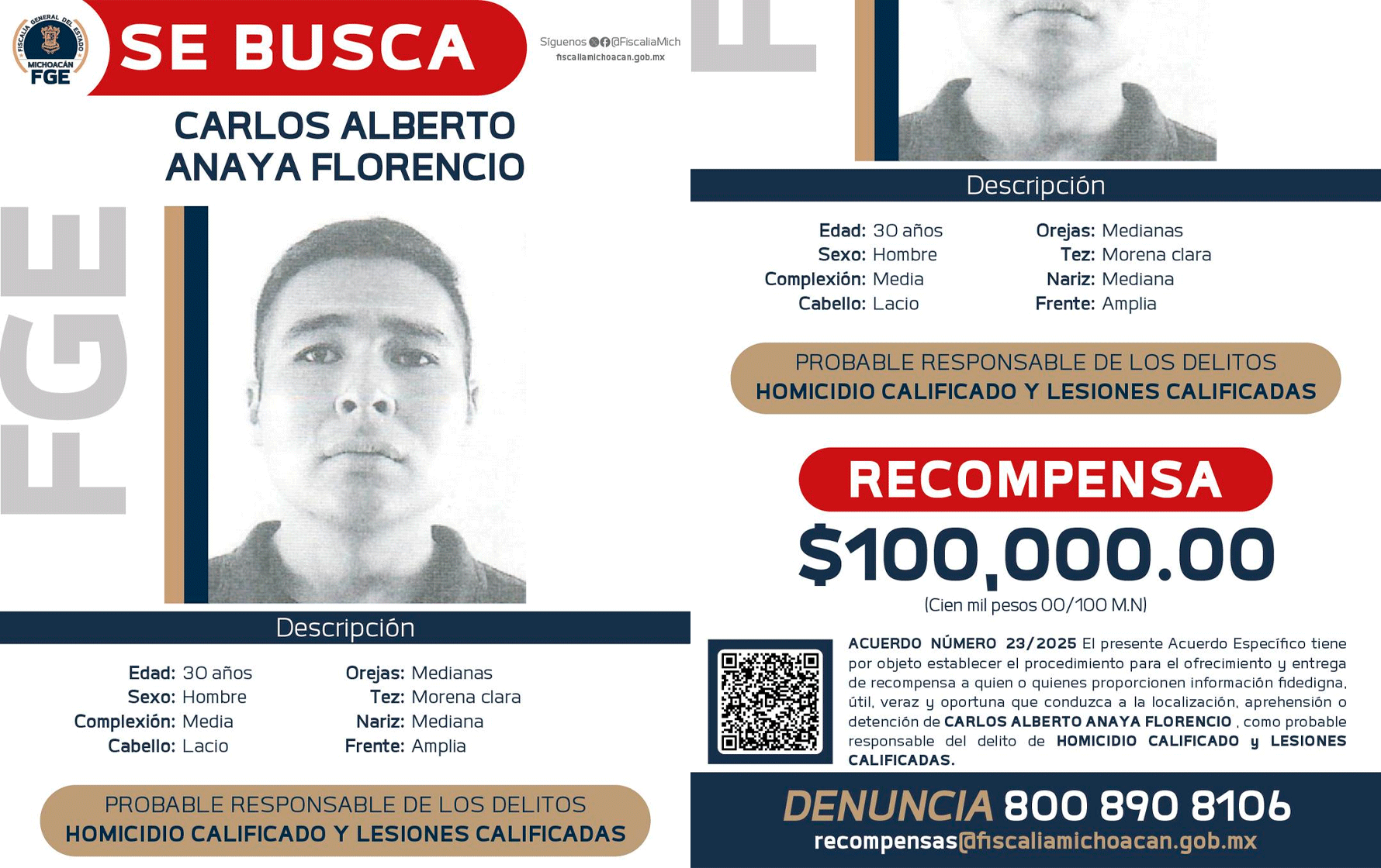 Morelia, Michoacán, 30 de diciembre de 2025.– La Fiscalía General del Estado de Michoacán (FGE) emite una cédula de ofrecimiento de recompensa de hasta 100 mil pesos para quien aporte información que permita la localización y detención de Carlos Alberto Anaya Florencio, señalado como probable responsable del homicidio de María de los Ángeles E., de 23 años, y de lesiones calificadas en agravio de Irving David C., de 20.
