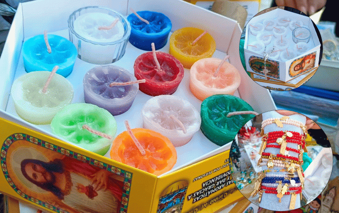 Estos rituales de Año Nuevo se pueden adquirir prácticamente en cualquier entrada a las iglesias católicas, también hay semillas, borregos para la abundancia y hasta pulseras.