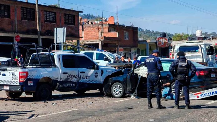 Pátzcuaro, Mich.- Viernes 02 de enero de 2026.- Tres vehículos, entre ellos una camioneta patrulla de la Guardia Civil (GC), protagonizaron un choque sobre la carretera Pátzcuaro-Quiroga, hecho que dejó al menos ocho personas heridas: cinco oficiales y tres civiles, de acuerdo con información preliminar.