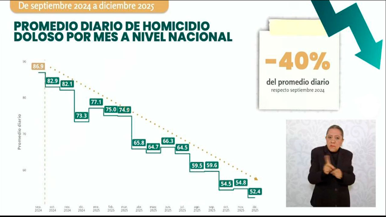 El gobierno federal informó que el promedio diario de homicidios dolosos en México registró una disminución del 40 por ciento entre septiembre de 2024 y diciembre de 2025, de acuerdo con cifras oficiales presentadas por el Gabinete de Seguridad y el Secretariado Ejecutivo del Sistema Nacional de Seguridad Pública.