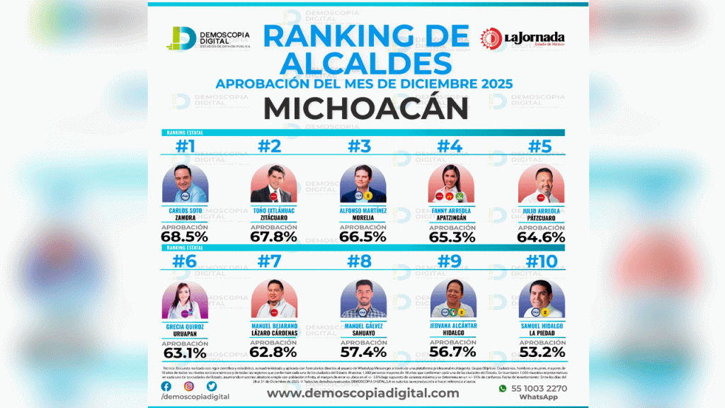 Morelia, Michoacán, a 10 de enero de 2026.- El presidente municipal de Pátzcuaro, Julio Arreola, registró 64.6% de aprobación en la evaluación de diciembre de 2025, de acuerdo con el ranking estatal difundido por Demoscopia Digital en colaboración con La Jornada.