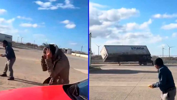 El incidente quedó registrado en diversos videos difundidos en redes sociales, donde se observa cómo la fuerza del viento derriba la caja de un tráiler que se encontraba estacionado. En otras grabaciones se aprecia el vehículo ya volcado, mientras personas en el lugar buscan resguardarse ante las condiciones adversas.