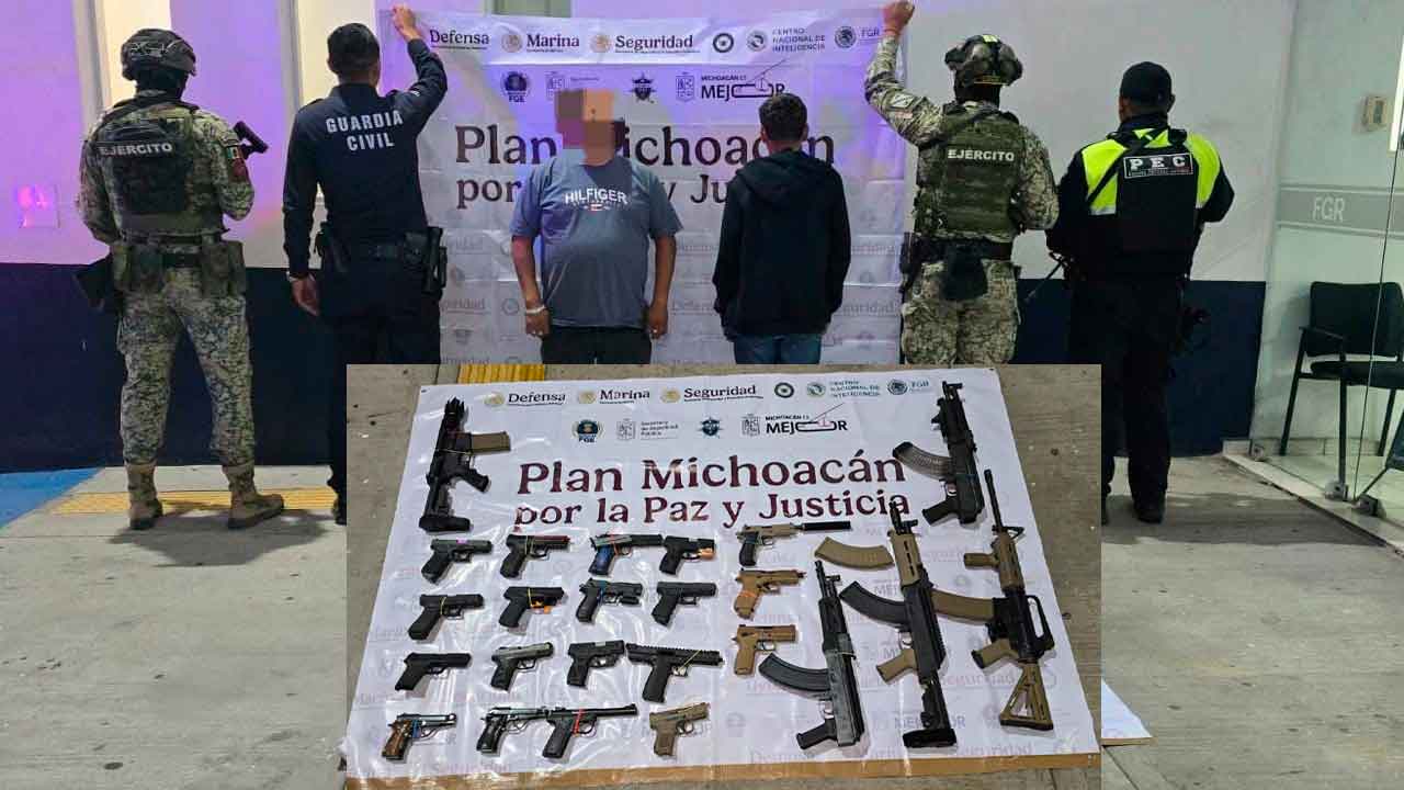 Morelia, Michoacán, 13 de enero de 2026.- Resultado del operativo interestatal y del reforzamiento a las acciones para la disuasión del delito entre Michoacán y Guanajuato, en la zona limítrofe entre ambas entidades se realizó el aseguramiento de un hombre y un menor de edad en posesión de 24 armas de fuego.